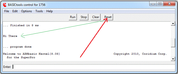 Start the BASICtools from the Start-Menu or from the Desktop Icon. You should see a welcome message which has been sent from the ARM processor-